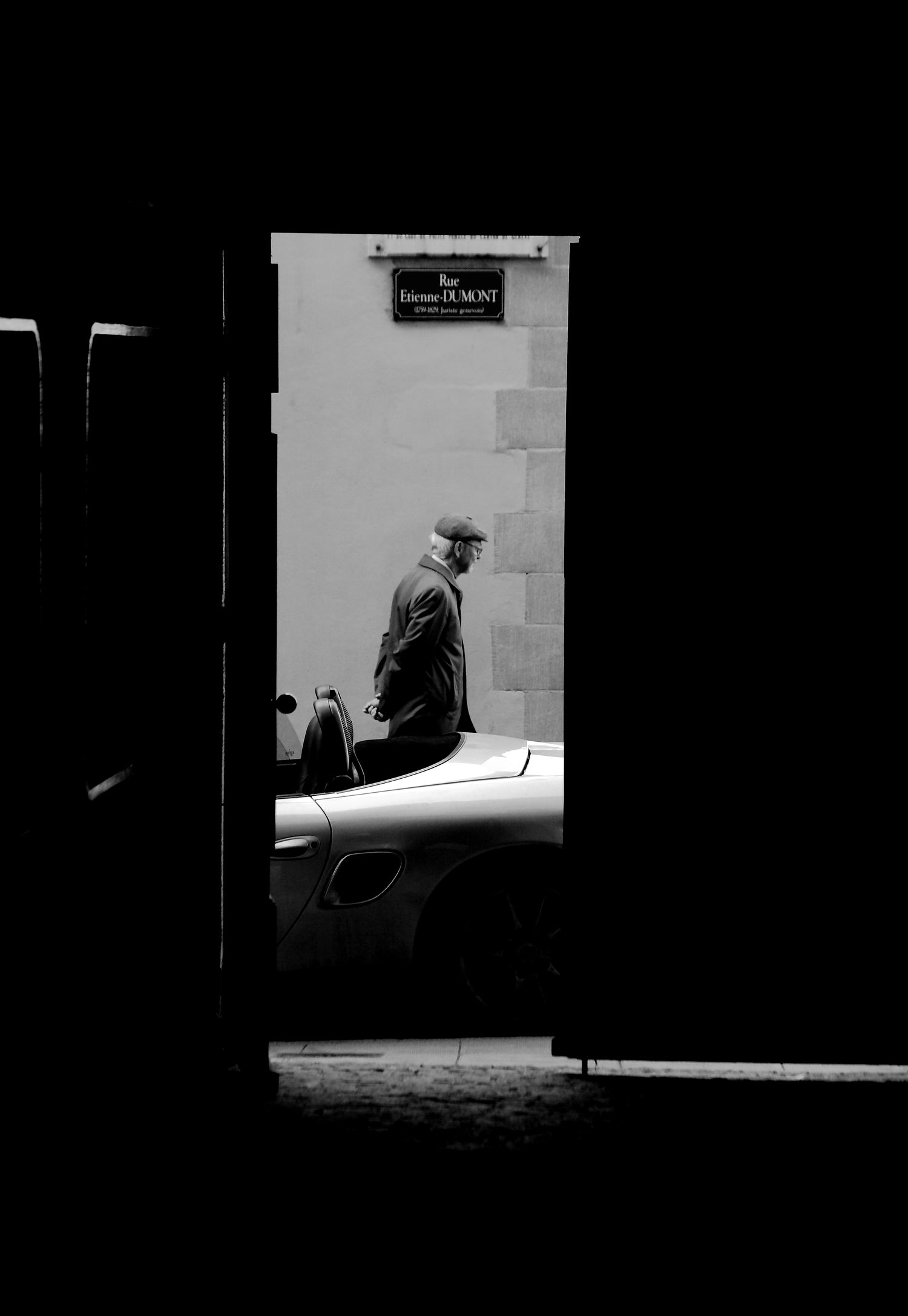 ヨーロッパの街を歩いていると、特に町の中心にある旧市街地区では自分の歩き方がバカにセコセコしているなと気づかされて恥ずかしくなることが度々ある。東京ではとても考えられないくらい皆がゆっくりと生活している。この写真は写真なので止まっているけれども、それでも容易に全てがゆっくりと動いているイメージが伝わってくる。中心の老紳士の姿だけではない。正面の石の壁からも、手前の分厚い木製のゲートからも悠久の歴史の重厚さが漂ってくる。そんな中にあって何故かそこに路上駐車しているスポーツカーが実に対照的だ。なのだけれども少しの違和感も感じない。その紳士が運転してきたのだとしても全くおかしく無い。何故だろうか?ここに収まっているもの全て、正面の道標も紳士のベレー帽も含めてデザイン的に調和がとれている。文化の高さ、厚さ、重さの結果に違いない。